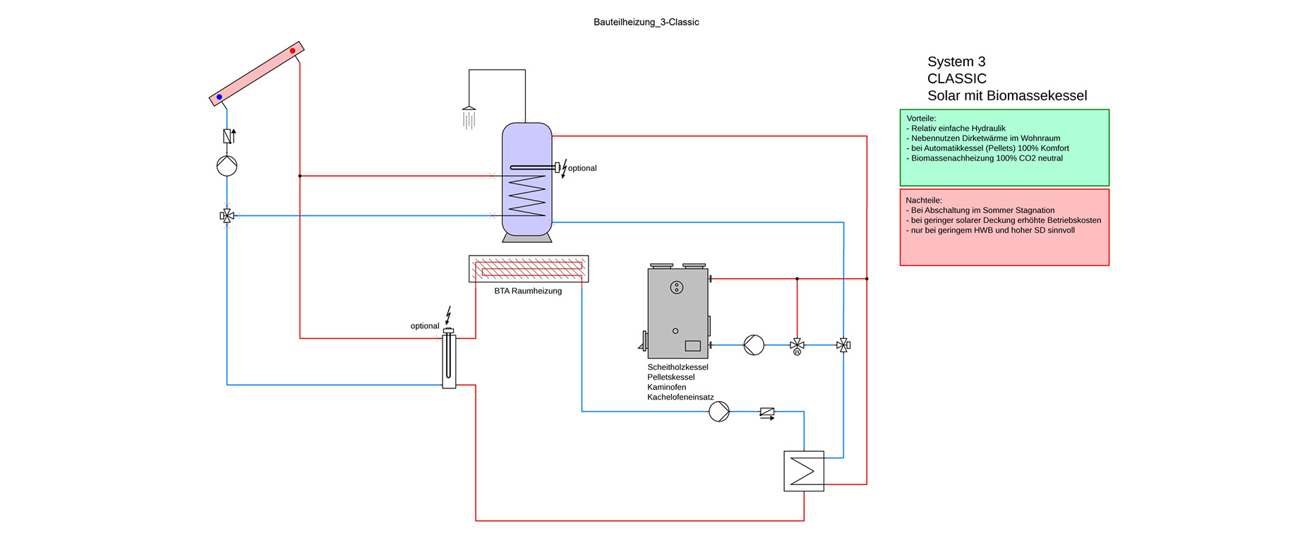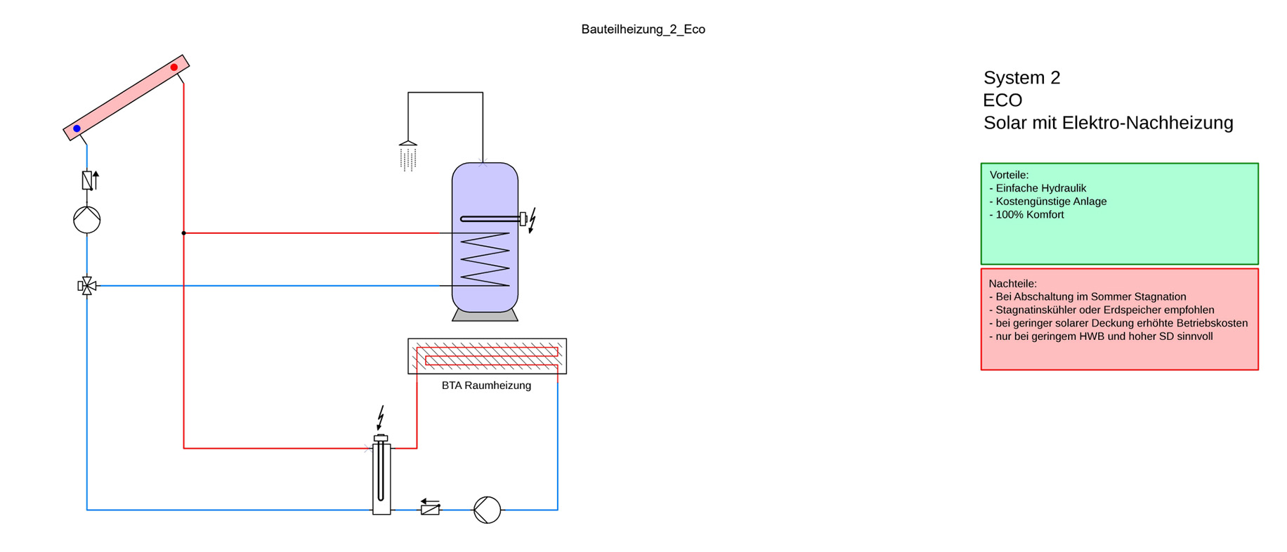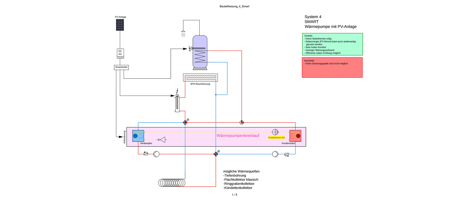 Diese Form der Energiespeicherung eignet sich am besten für Solarhäuser oder Sonnenhäuser. An einem sonnigen Wintertag kann man in wenigen Stunden den Energiebedarf für mehrere Tage ernten und im Beton speichern. Wenn 2-3 Tage lang keine Sonne scheint, ist das Haus trotzdem noch warm. Erst wenn längere Zeit keine Sonne scheint, muss mit dem Zusatzheizsystem nachgeheizt werden.