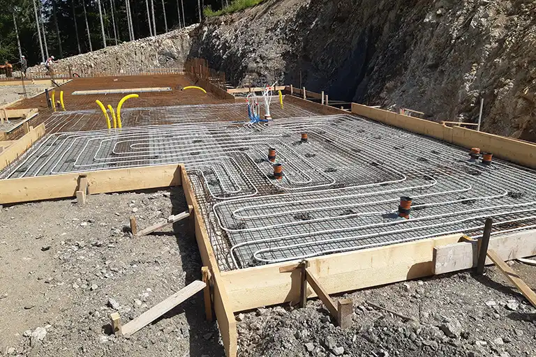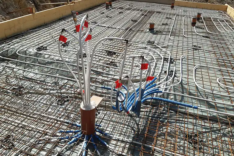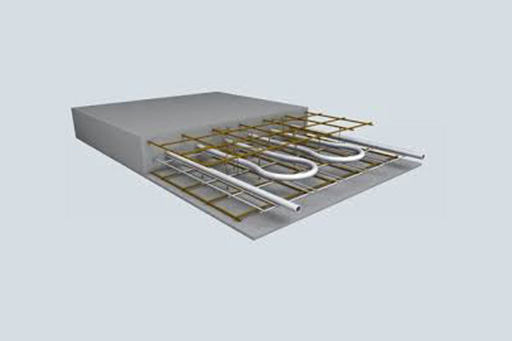 Neben der Funktion der Statik und der Formgebung kommt nun eine dritte Komponente hinzu: Rohrleitungen werden vor dem Betonieren direkt in die Decken und Bodenplatten eingebaut. Ähnlich wie bei einer Fußbodenheizung werden diese später mit einem Wärmeträger durchströmt und können dort Wärme abgeben (Heizen) oder Wärme aufnehmen (Kühlen).